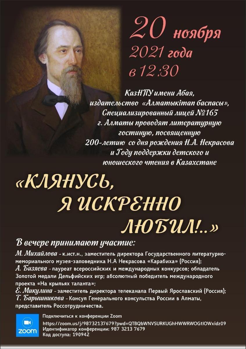 20 ноября 2021 года с участием лицеистов Специализированного лицея №165 и студентов филологического факультета КазНПУ имени Абая прошла литературная гостиная «Клянусь, я искренно любил!..», посвященная 200-летию со дня рождения Н.А. Некрасова и Году поддержки детского и юношеского чтения в Казахстане. Приветствуя гостей, Татьяна Барышникова, Консул Генерального консульства России в Алматы, представитель Россотрудничества, сказала о роли Николая Некрасова в истории литературы и культуры.