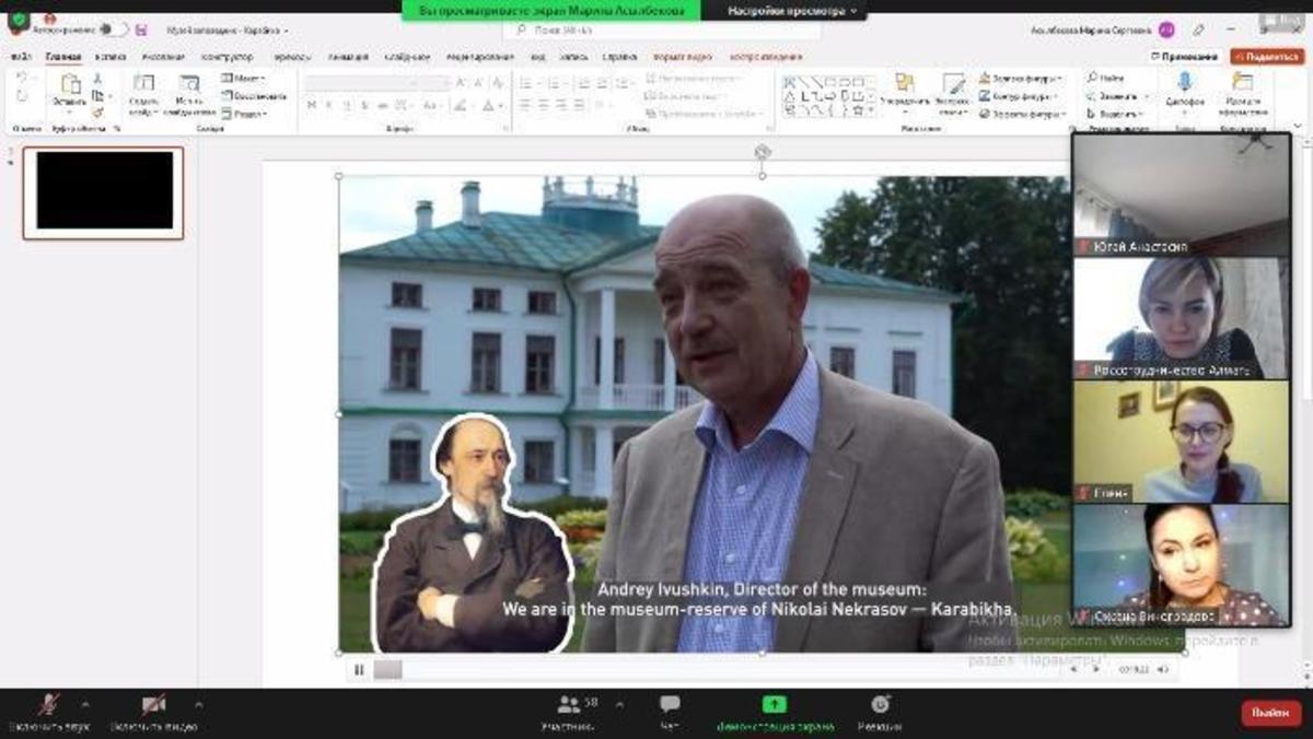 Учащиеся 8А и 8Б класса подготовили литературную композицию, посвященную жизни и творчеству Н. Некрасова. Большой интерес вызвала лекция Марины Михайловой, к.ист.н., заместителя директора Государственного литературно-мемориального музея-заповедника Н.А Некрасова «Карабиха». Она рассказала о писателе как о человеке, который сделал себя сам («self-made man»). Елена Микулина, заместитель директора телеканала Первый Ярославский, поделилась с участниками встречи творческими проектами, которые ведет ярославское телевидение в течение юбилейного некрасовского года.