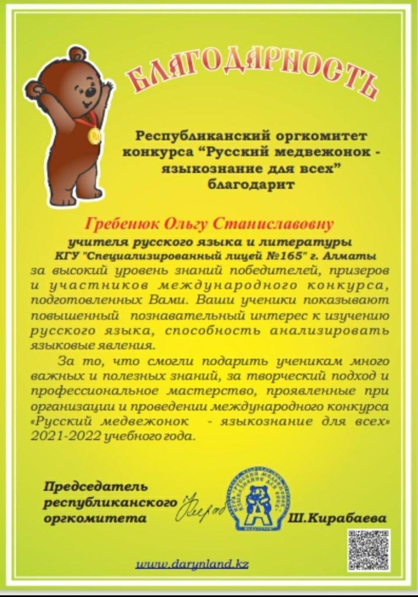 Гребенюк О.С.- учителю русского языка и литературы выражаем благодарность за отличную подготовку к данному конкурсу наших ребят! Молодцы!