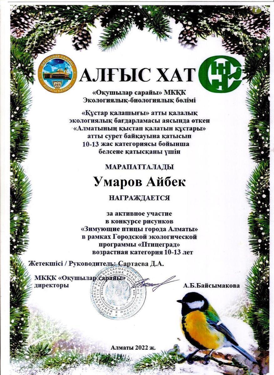 Своевременная помощь птицам в течение года, а также формирование у учащихся экологической культуры, ответственного отношения к птицам родного края, воспитание бережного отношения к природе - таковы задачи Городского конкурса рисунков "Зимующие птицы города Алматы". В этом конкурсе принял участие Умаров Айбек, лицеист 6 класса. Руководитель Сартаева Д.А. Поздравляем! Творческих успехов!