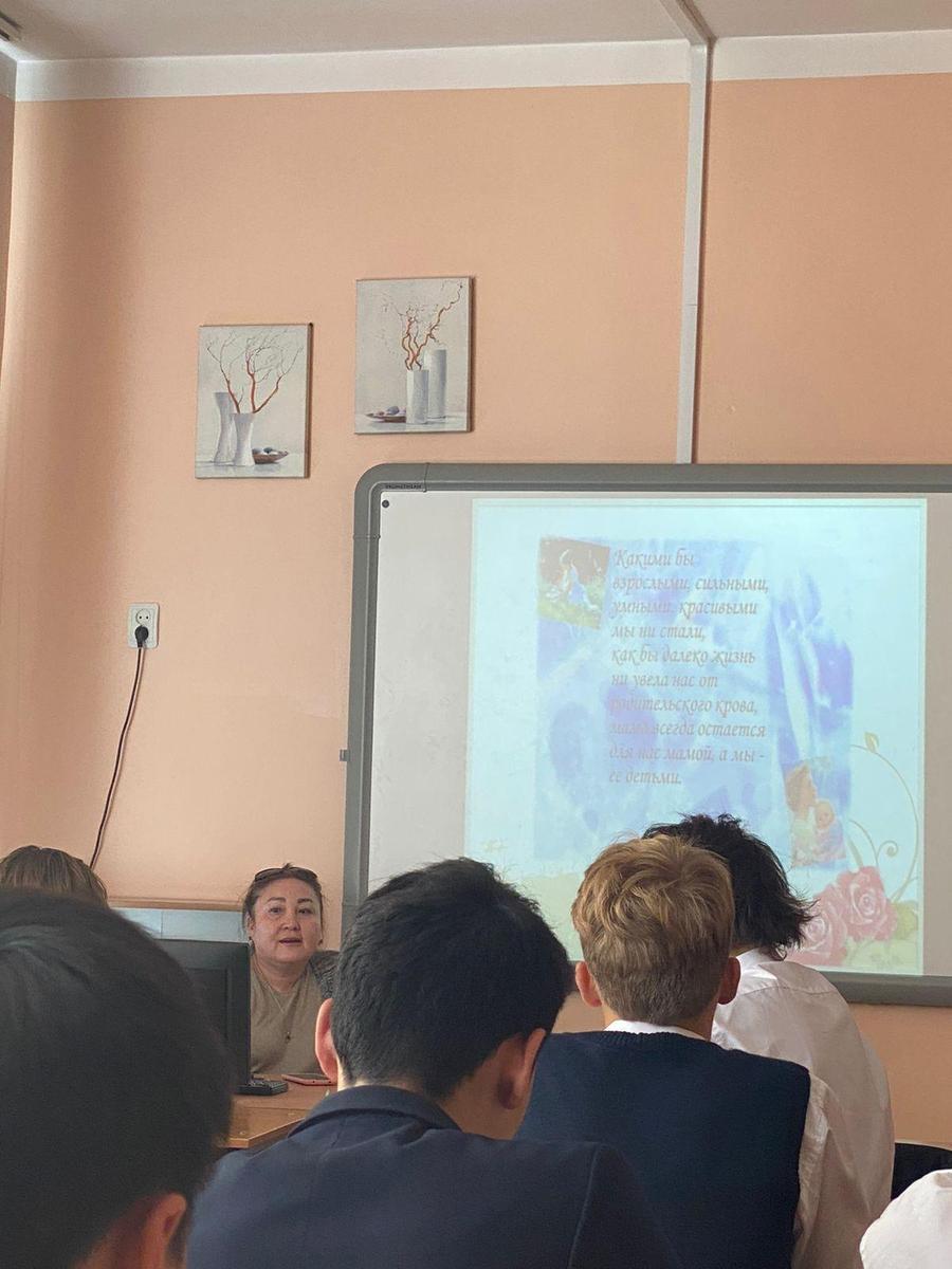 Классный руководитель Құралбай Қарлығаш Дауытбекқызы на классном часе в 8А классе рассказала об истории чествования женщины -матери, которая существует с 2012 года. Поговорила по душам с детьми об их семьях, о мамах. Самый важный человек в жизни – мама. К ней мы ходим за советом, в ней мы делимся радостями и печалями, любовь матери бескорыстна и вечна. «Жұмақ – ананың табанының астында» - гласит народная пословица.