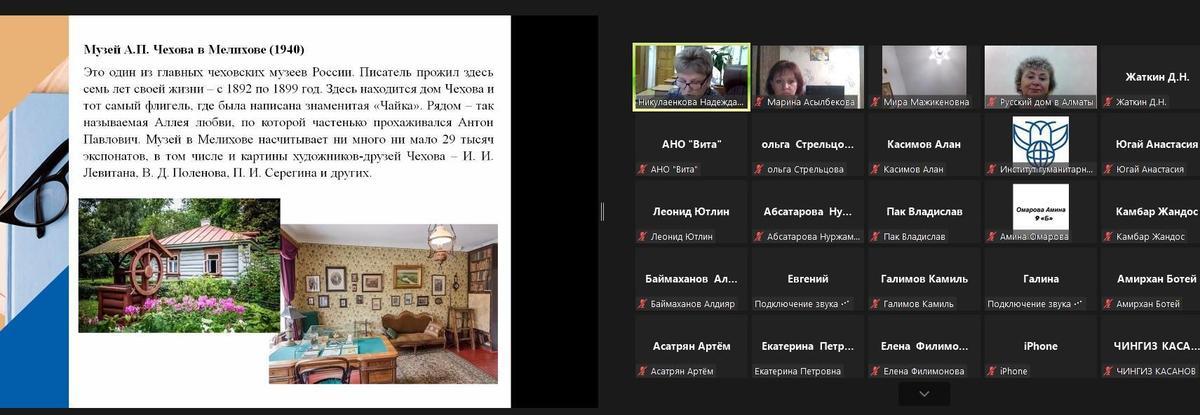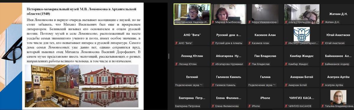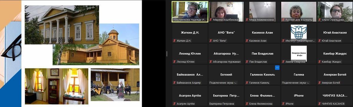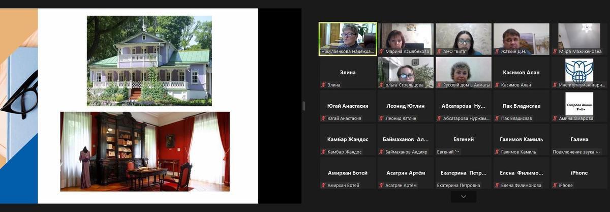 Алматыдағы орыс үйінің қолдауымен Мәскеу "Вита" орталығы өткізетін "оқу шеңбері" білім беру және мәдени-ағарту іс-шараларының шеңберінде 7 қазанда Алматы қаласындағы №165 мамандандырылған лицейдің тоғызыншы сынып оқушыларына "Ресейдің әдеби мұражайларындағы орыс классикасы"виртуалды экскурсиясы өтті. Пенза облысының еңбек сіңірген мәдениет қызметкері Надежда Никулаенкова Царское Селода, Михайловский мен Болдинода Пушкин мұражайларының құрылу тарихы, Тарханадағы М. Ю. Лермонтов мұражай-қорығы, Н. А. Некрасовтың "Карабиха" мұражайы, Л. Н. мұражайы туралы, Толстой Ясная Полянада, Переделкинодағы керемет балалар ертегішісі К.И. Чуковскийдің мұражайы туралы айтты. Жарқын, қызықты экскурсия тағы да лицейшілерге ақындар мен