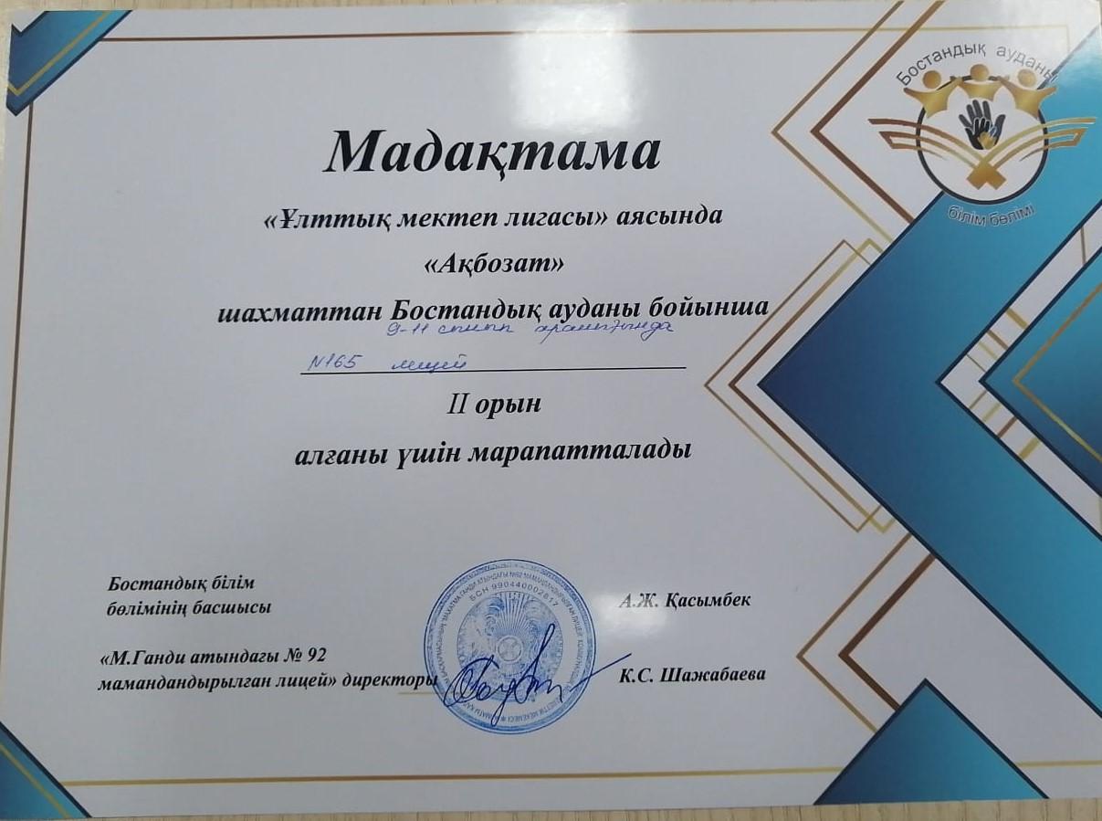12 қарашада №165 мамандандырылған лицей командасы 9-11 сынып оқушылары арасында шахматтан аудандық іріктеу чемпионатында 2 орын алды. Ансар Құрманалиев, Жәңгір Қалиақперов, Әлия Темірханқызы және Санжар Қайратов қатысты.