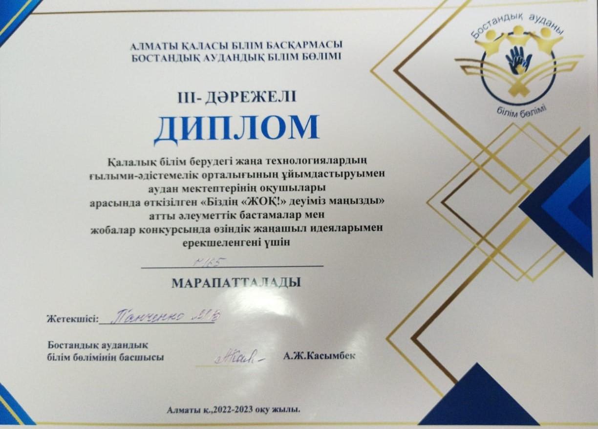 2022 жылғы 24 қарашада № 165 мамандандырылған лицейдің 9 сынып оқушылары "Есірткіге жол ЖОҚ!" әлеуметтік бастамалар жобасының аудандық кезеңінде "үгіт бригадасының “Біз есірткіге қарсымыз!” өнер көрсетуімен 3 орын алды!