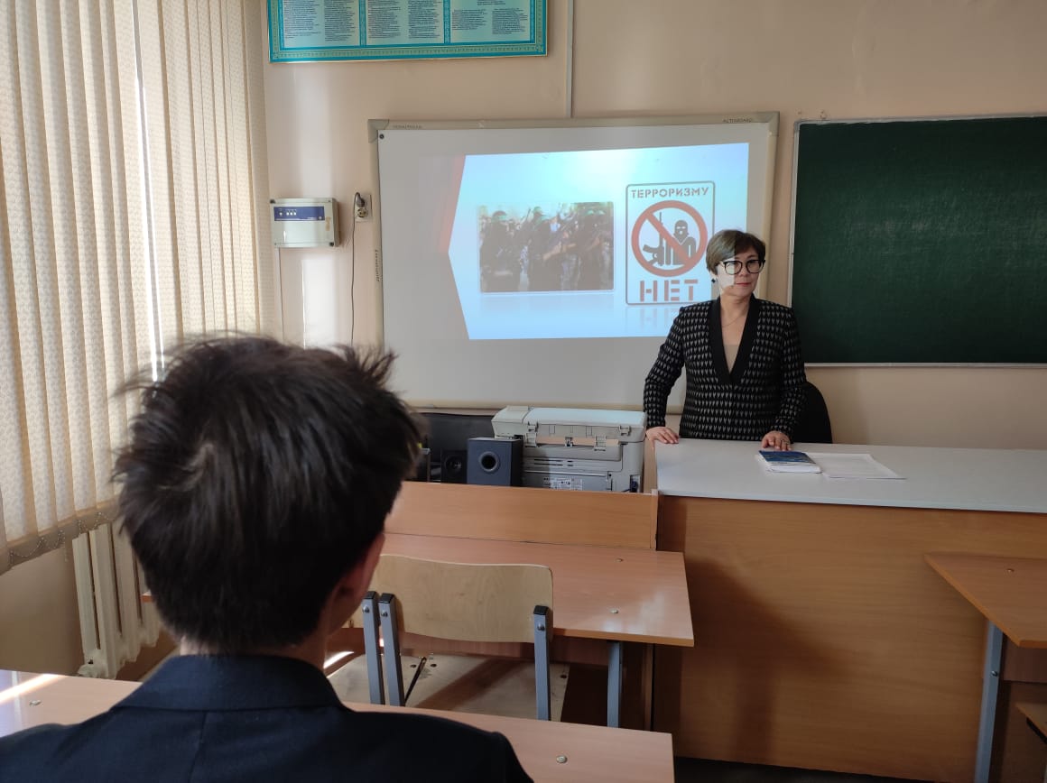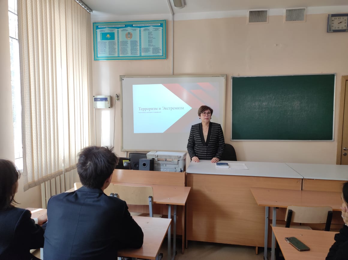 2023 жылғы 31 қаңтарда лицейдің 7-9 сыныптарында «Экстремизм және терроризм дегеніміз не?», «Терроризм – қоғамға төнген қауіп» атты тақырыптарға сынып сағаттары өтті. Сынып жетекшілері әртүрлі әдістеме түрін қолданды: сұхбаттасу, сауалнамалар жүргізу, пікір алмасу, баяндамалар.