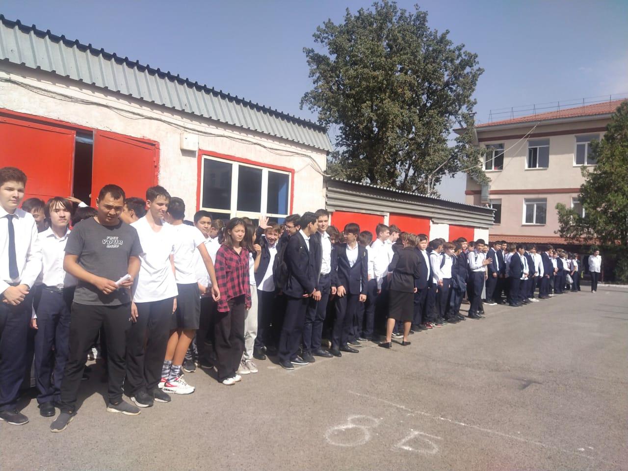 Сигнал естілді, балалар аулаға жиналды, мұғалімдер оларды сынып бойынша жинап, барлығының бар-жоғын тексерді. "Үйінділердің астында қалғандар жоқ!"- ұйымдастырушы АӘД оқытушысы Е. Б. Нашенов лицей директоры Е. С. Баековке есеп берді.