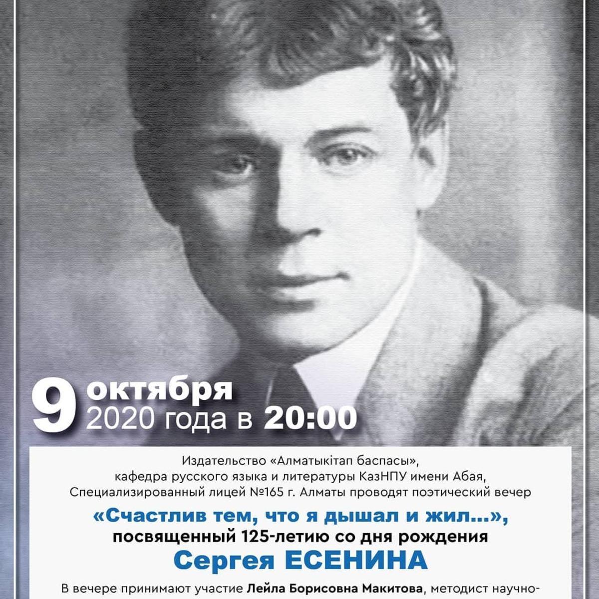 9 октября 2020 года прошел онлайн поэтический вечер, посвященный 125-летию со дня рождения великого русского поэта - Сергея Есенина. Организатором данного мероприятия стали: кафедра русского языка КазНПУ имени Абая, издательство "Алматы кiтап баспасы" и наш специализированный 165 лицей во главе с Асылбековой Мариной Сергеевной, учителем русского языка и литературы. Также, в вечере принимали участие Лейла Борисовна Макитова, методист научно-просветительского отдела Московского государственного музея С.А. Есенина и Ольга Вячеславовна Мощеева, главный специалист-эксперт Генерального консульства РФ в Алматы.